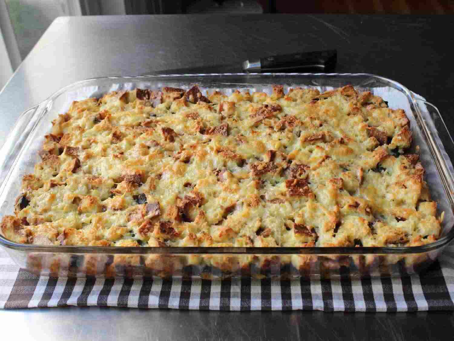 - Step 7:Bake strata in preheated oven until set, about 45 minutes. Optionally, you can broil the strata for a minute or two to brown the top. Chef John